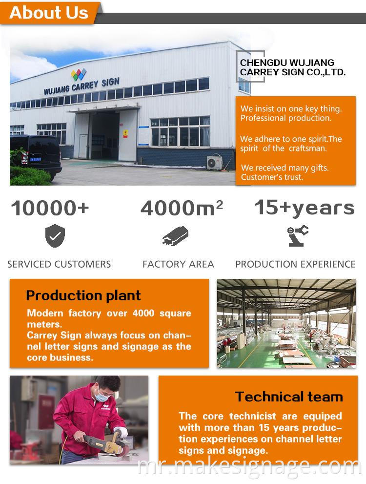 फ्रंटलिट आणि बॅकलिट एलईडी चॅनेल लेटर विस्तृत लेटर साइन अनुप्रयोगांसाठी डिझाइन केलेले आहे. किरकोळ केंद्रे, व्यावसायिक व्यवसाय आणि आतिथ्यसाठी आदर्श. तंत्रज्ञानासाठी आपल्या विविध आवश्यकता पूर्ण करण्यासाठी आमच्याकडे सर्वात व्यावसायिक टीम आहे. उत्कृष्ट वेल्डिंग आणि निर्दोष पॉलिशिंग अक्षरांच्या उच्च गुणवत्तेची हमी देते. समोर आणि मागील दोन्ही बाजूंनी ry क्रेलिक. अधिक लक्ष आकर्षित करणे आणि एक उच्च-अंत लुक तयार करणे. एलईडी अक्षरे इमारती, खिडक्या किंवा छतावर प्रकाश टाकतात, ही अक्षरे येणा years ्या अनेक वर्षांपासून चमकदारपणे चमकतील.